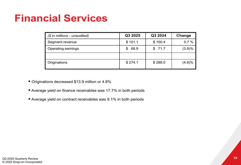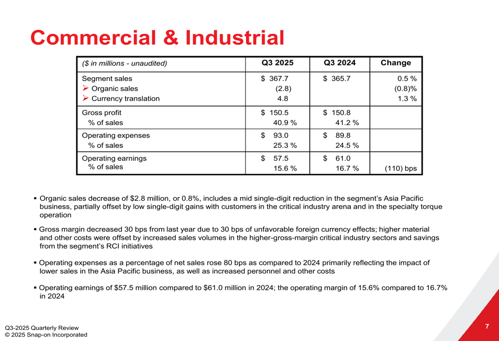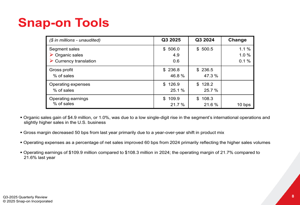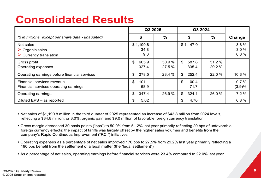 A Snap-On reportou vendas líquidas consolidadas de US$ 1.190,8 milhões no 3º tri de 2025, representando um aumento de 3,8% em relação aos US$ 1.147,0 milhões no mesmo período do ano anterior. As vendas orgânicas cresceram 3,0%, com a conversão favorável de moeda contribuindo com 0,8% adicionais.