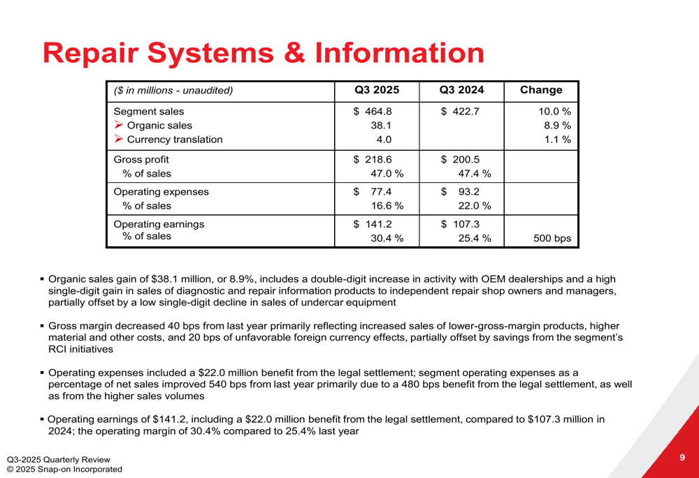 O segmento de Sistemas de Reparo e Informação foi o destaque, com vendas aumentando 10,0% para US$ 464,8 milhões, impulsionadas por maior atividade com concessionárias de montadoras e forte desempenho em produtos de diagnóstico e informações de reparo. O lucro operacional neste segmento aumentou 31,6% para US$ 141,2 milhões, beneficiando-se de um acordo judicial de US$ 22,0 milhões. Mesmo sem esse benefício único, o segmento mostrou crescimento orgânico substancial.