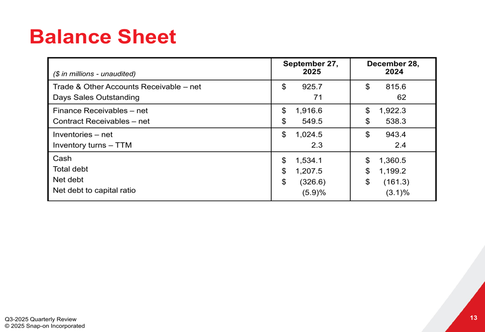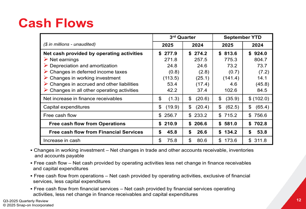 A Snap-On continua demonstrando fortes capacidades de geração de caixa, com fluxo de caixa livre no 3º tri de 2025 de US$ 256,7 milhões, acima dos US$ 233,2 milhões no 3º tri de 2024. O fluxo de caixa livre acumulado no ano é de US$ 715,2 milhões, embora ligeiramente abaixo dos US$ 756,6 milhões reportados para o mesmo período em 2024.
