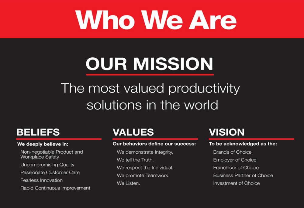 O compromisso da Snap-On com seus valores fundamentais e missão de ser "as soluções de produtividade mais valorizadas no mundo" continua a orientar sua direção estratégica: