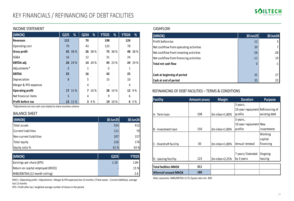 A Soiltech reportou resultados financeiros excepcionais para o 2º tri de 2025, com receitas atingindo NOK 112 milhões, representando um aumento de 61% em comparação ao mesmo período do ano passado e um aumento sequencial de 30% em relação ao 1º tri de 2025.
