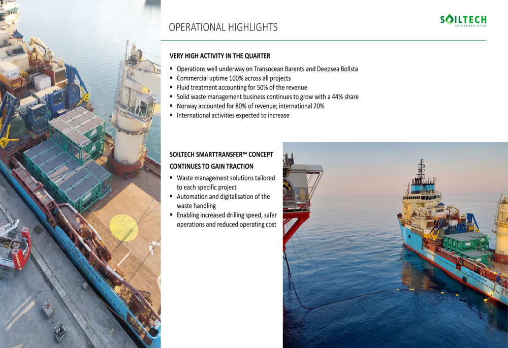 A empresa se posicionou como uma fornecedora inovadora de tecnologia focada em soluções sustentáveis de gestão de resíduos para o setor energético, com operações principalmente na Noruega, mas com presença internacional crescente. O modelo de negócios da Soiltech parece estar ganhando tração significativa, como evidenciado pelos resultados financeiros apresentados.