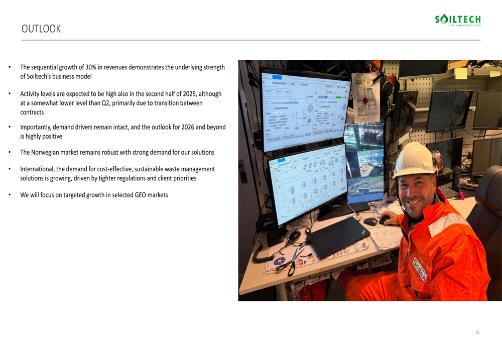 A Soiltech indicou que os impulsionadores da demanda permanecem intactos e que as perspectivas para 2026 e além são "altamente positivas". O mercado norueguês continua robusto, enquanto a demanda internacional por soluções de gestão de resíduos sustentáveis e econômicas está crescendo. A administração planeja focar no crescimento direcionado em mercados geográficos internacionais selecionados.