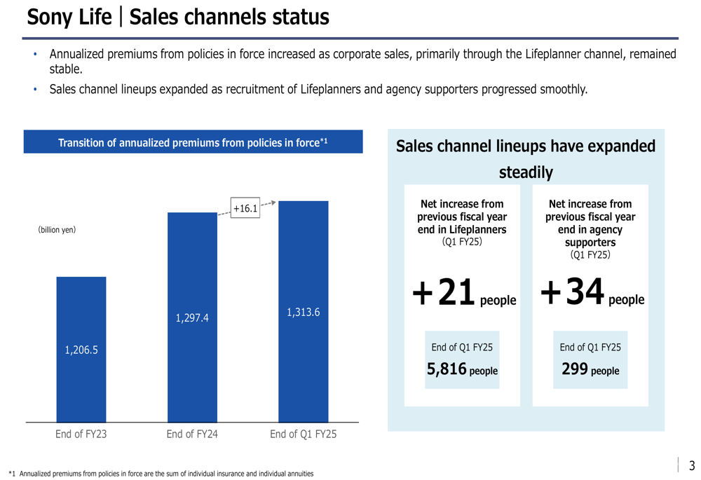 Nos canais de vendas da Sony Life, a empresa manteve um crescimento estável nos prêmios anualizados de apólices em vigor, que aumentaram para 1.313,6 bilhões de ienes no 1º tri do ano fiscal de 2025, de 1.297,4 bilhões de ienes no final do ano fiscal de 2024. Este crescimento foi impulsionado principalmente por vendas corporativas através do canal Lifeplanner.