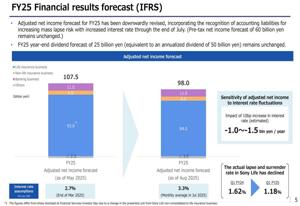 O Sony Financial Group revisou para baixo sua previsão de lucro líquido ajustado para o ano fiscal de 2025, da projeção de maio de 2025 de 107,5 bilhões de ienes para 98,0 bilhões de ienes. Esta revisão incorpora o reconhecimento de passivos contábeis para o aumento do risco de resgate em massa associado ao aumento das taxas de juros.