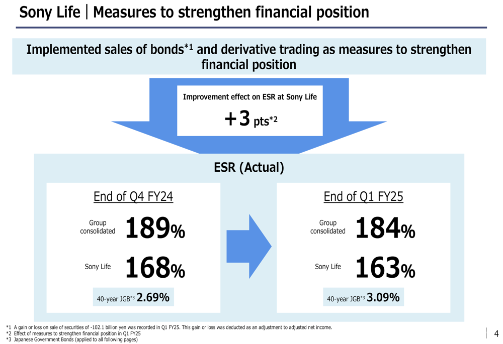 O aumento das taxas de juros tem exercido pressão sobre o índice de solvência econômica (ESR) do Sony Financial Group, um indicador-chave de solidez financeira. O ESR consolidado do Grupo diminuiu de 189% no 4º trimestre do ano fiscal de 2024 para 184% no 1º tri do ano fiscal de 2025, enquanto o ESR da Sony Life caiu de 168% para 163% durante o mesmo período.
