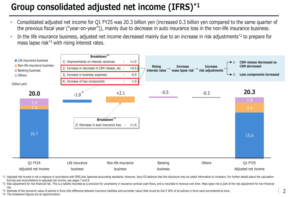 O Sony Financial Group reportou um lucro líquido ajustado consolidado de 20,3 bilhões de ienes no 1º tri do ano fiscal de 2025, representando um leve aumento de 0,3 bilhão de ienes em comparação com o mesmo período do ano anterior. Este crescimento modesto foi impulsionado principalmente pelo melhor desempenho no segmento de seguros não-vida, que compensou as quedas nos negócios de seguros de vida e bancário.