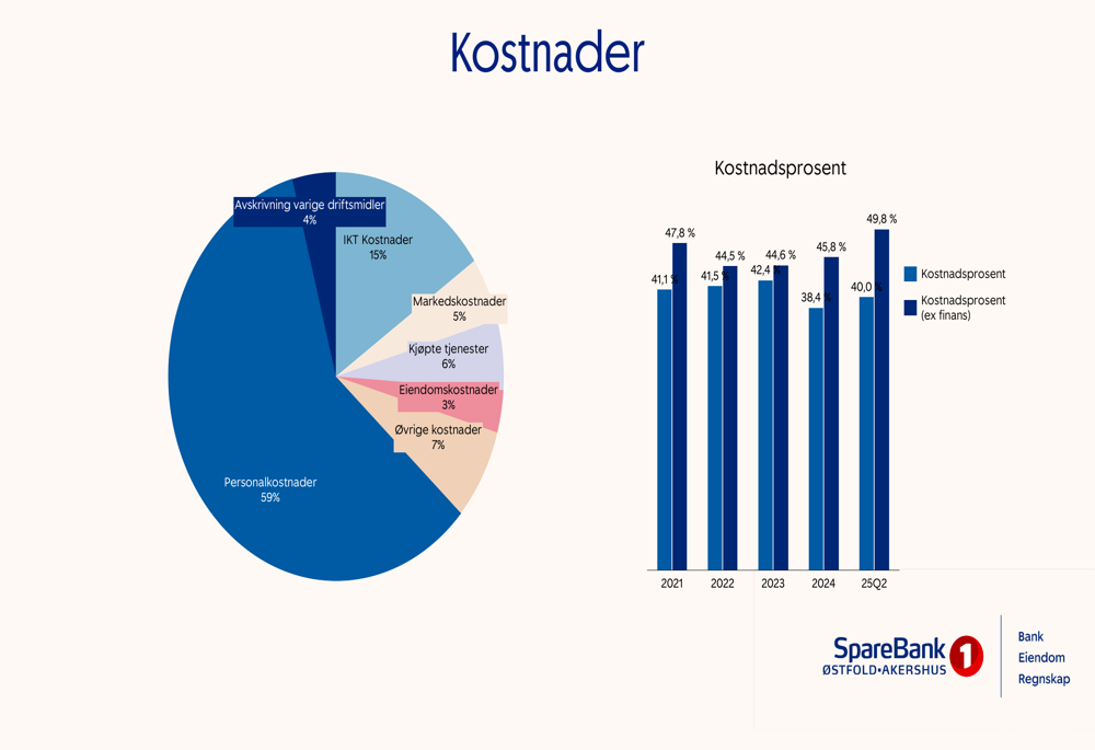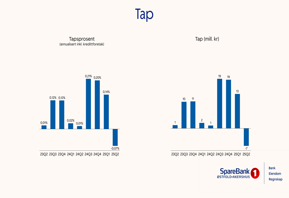 As perdas com empréstimos tornaram-se positivas no 2º tri de 2025, com uma reversão de NOK 7 milhões em comparação com uma perda de NOK 1 milhão no 2º tri de 2024. Isso contribuiu positivamente para o lucro trimestral. O índice de perdas para o 2º tri de 2025 foi de -0,07%, em comparação com 0,01% no 2º tri de 2024.