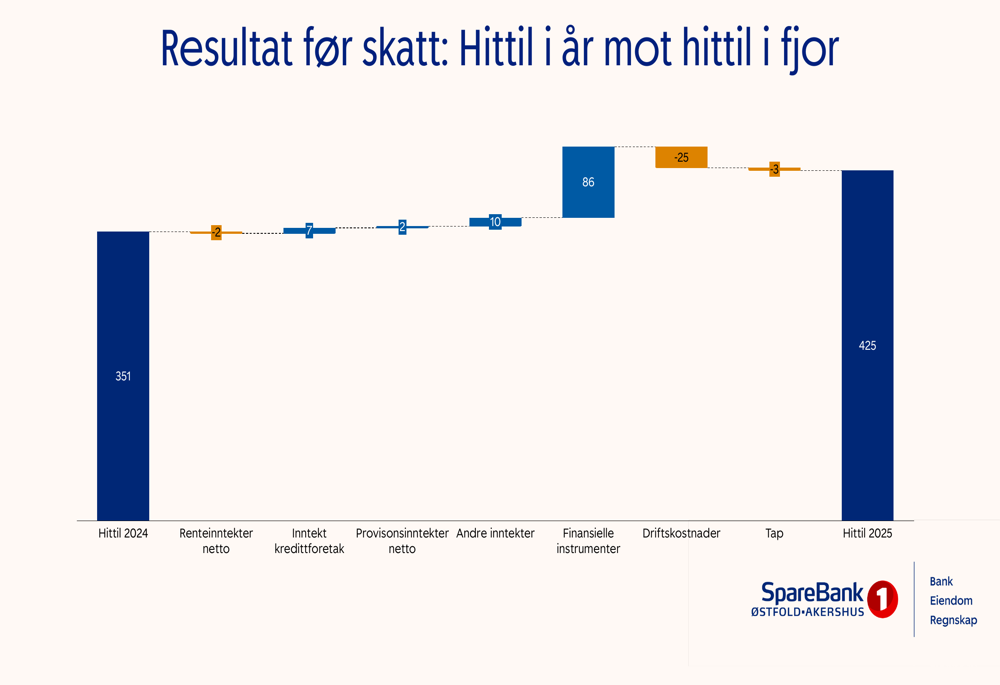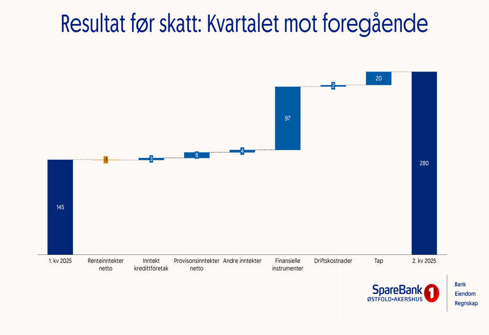 O SpareBank 1 Østfold Akershus reportou um lucro antes de impostos de NOK 280 milhões para o 2º tri de 2025, representando um aumento substancial de 64% em relação aos NOK 171 milhões no mesmo trimestre do ano anterior. O impressionante crescimento foi impulsionado principalmente por instrumentos financeiros, que contribuíram com NOK 105 milhões para a melhoria ano a ano.