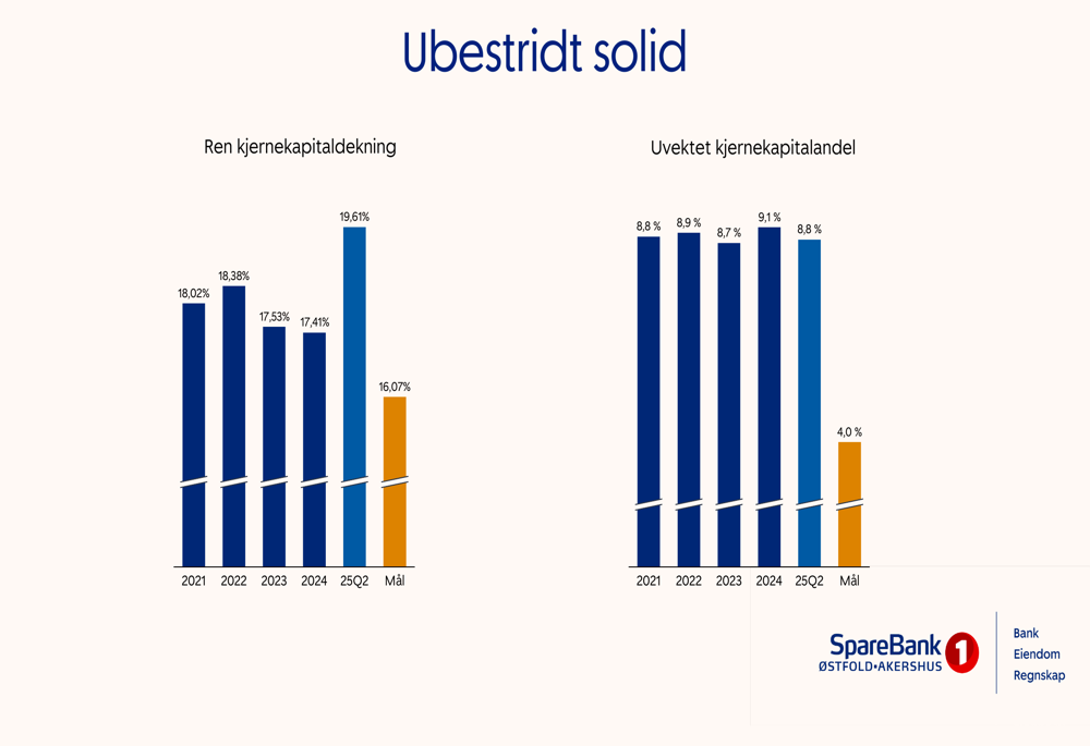 O SpareBank 1 Østfold Akershus manteve sua forte posição de capital com um Índice de Capital Principal de 19,61% no 2º tri de 2025, significativamente acima tanto do requisito regulatório quanto da própria meta do banco de 16,07%. Isso representa uma melhoria em relação aos 17,41% do final de 2024.