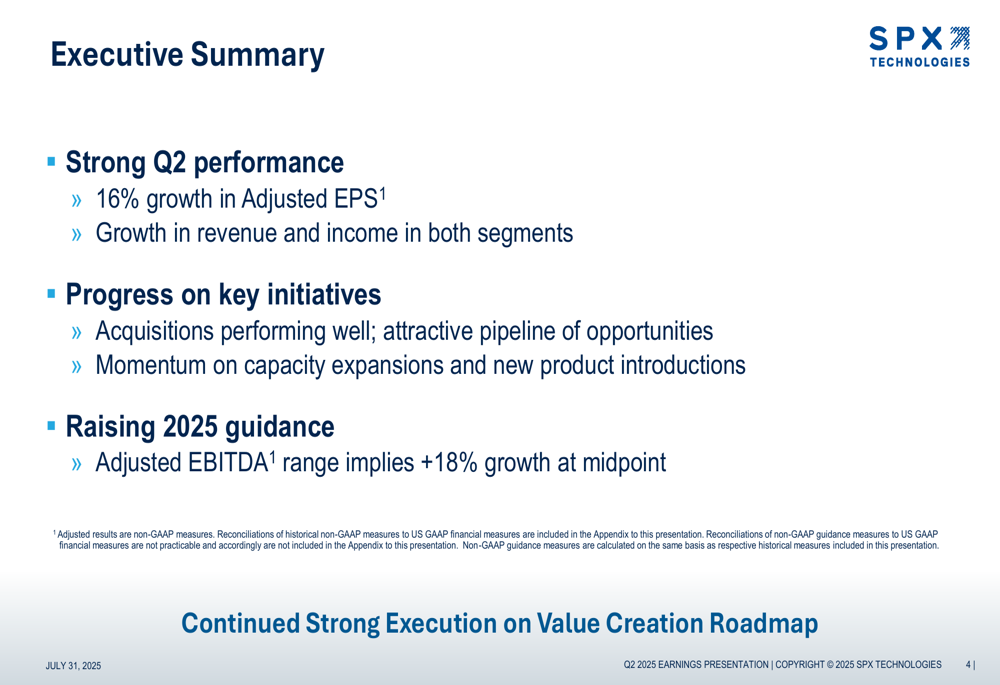 A SPX Technologies entregou resultados robustos no 2º tri de 2025, com lucro por ação ajustado crescendo 16% em comparação ao ano anterior e receita aumentando 10,2%. O forte desempenho levou a administração a elevar as projeções para o ano inteiro em todas as métricas-chave.