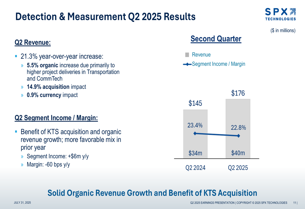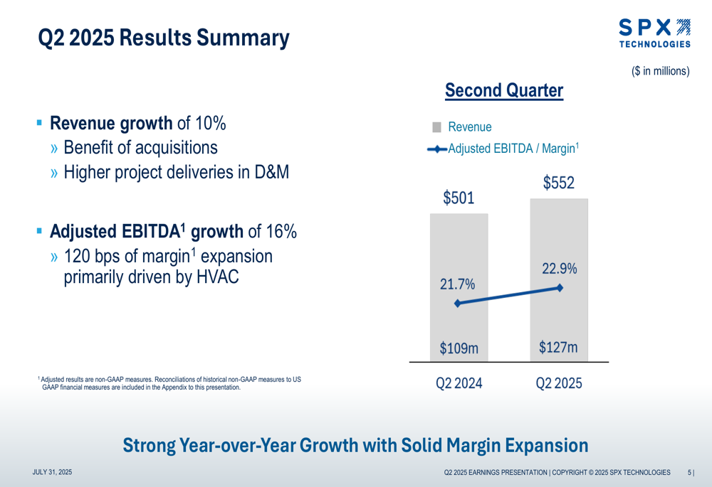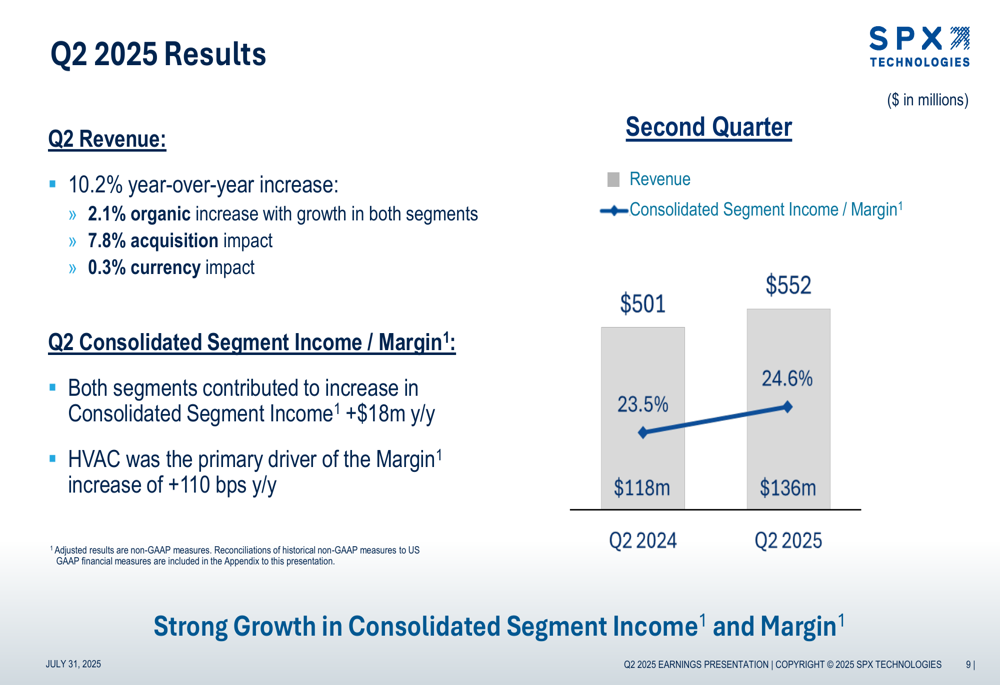 A SPX Technologies reportou receita de US$ 552 milhões no 2º tri de 2025, um aumento de 10,2% em relação aos US$ 501 milhões no mesmo período do ano passado. O crescimento incluiu 2,1% de crescimento orgânico, 7,8% de aquisições e 0,3% de impacto positivo cambial.