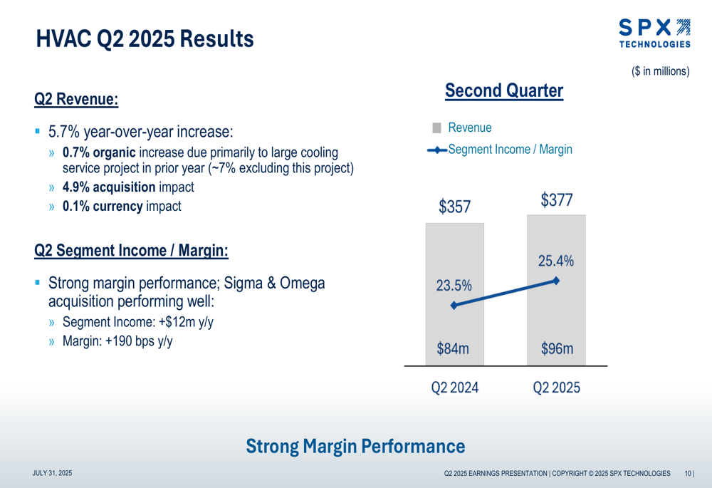 O segmento de HVAC, que representa aproximadamente 68% da receita total, apresentou forte desempenho de margem no 2º tri de 2025. A receita aumentou 5,7% em relação ao ano anterior, atingindo US$ 377 milhões, incluindo um aumento orgânico de 0,7%, 4,9% de aquisições e 0,1% de impacto cambial.