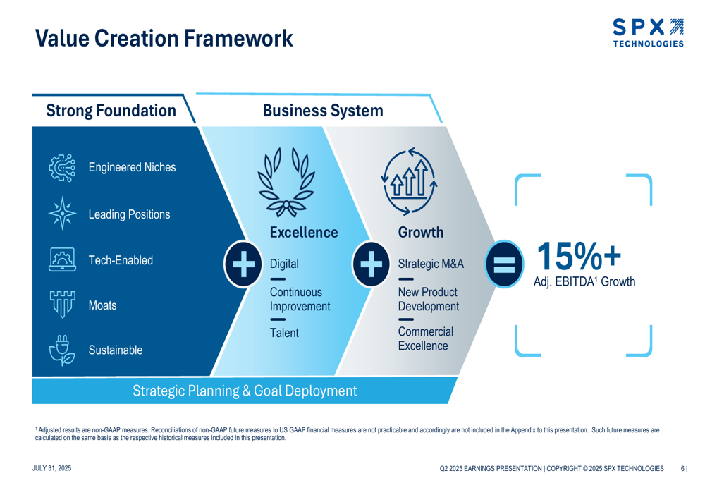 A SPX Technologies continua a executar seu modelo de criação de valor, que se concentra em nichos de engenharia, posições de liderança e soluções habilitadas por tecnologia. O sistema de negócios da empresa enfatiza a excelência por meio da transformação digital, melhoria contínua e desenvolvimento de talentos, juntamente com crescimento por meio de fusões e aquisições estratégicas e desenvolvimento de novos produtos.