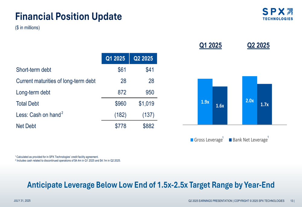 A SPX Technologies manteve uma sólida posição financeira, com dívida total de US$ 1.019 milhões e dívida líquida de US$ 882 milhões ao final do 2º tri de 2025. Os índices de alavancagem da empresa ficaram em 2,0x de alavancagem bruta e 1,7x de alavancagem bancária líquida, com a administração esperando que a alavancagem caia abaixo do limite inferior da faixa-alvo de 1,5x-2,5x até o final do ano.