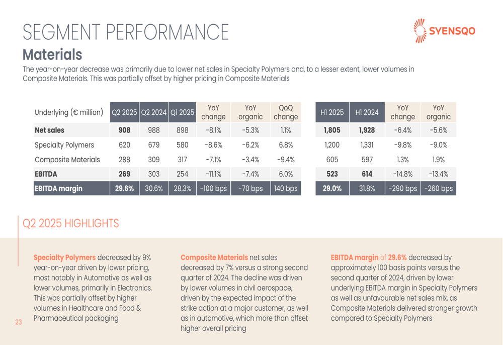 O segmento de Materiais, que inclui Polímeros Especiais e Materiais Compósitos, registrou uma queda de 9% ano a ano em Polímeros Especiais devido a preços mais baixos no setor Automotivo e volumes reduzidos em Eletrônicos. No entanto, o segmento se beneficiou de um crescimento de volume de 3% ano a ano em Polímeros Especiais (excluindo Eletrônicos) e crescimento de 2% em aplicações aeroespaciais civis e aplicações espaciais e de defesa.