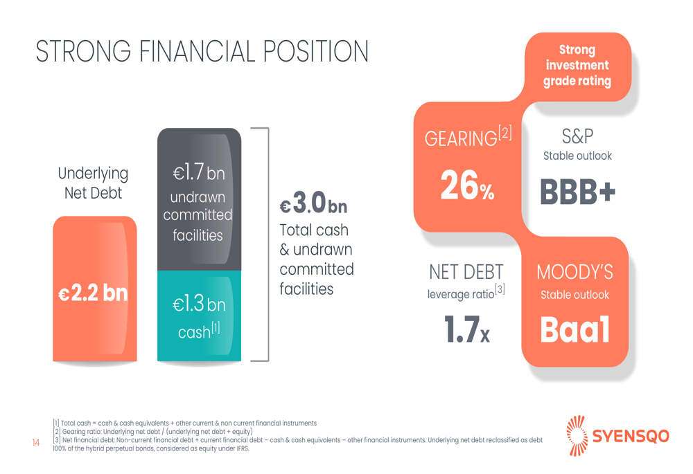 A Syensqo manteve uma forte posição financeira com €1,3 bilhão em caixa e €1,7 bilhão em linhas de crédito comprometidas não utilizadas, totalizando €3,0 bilhões em liquidez disponível. A dívida líquida subjacente da empresa era de €2,2 bilhões, com uma relação de alavancagem da dívida líquida de 1,7x e endividamento de 26%.