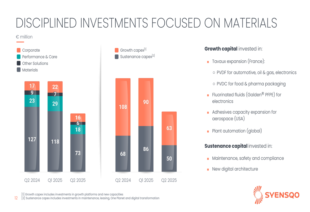 Os investimentos em capital permaneceram disciplinados e focados principalmente no segmento de Materiais, com investimentos de crescimento em áreas como PVDF para aplicações automotivas, petróleo e gás, e eletrônicos, bem como expansões de capacidade para adesivos aeroespaciais: