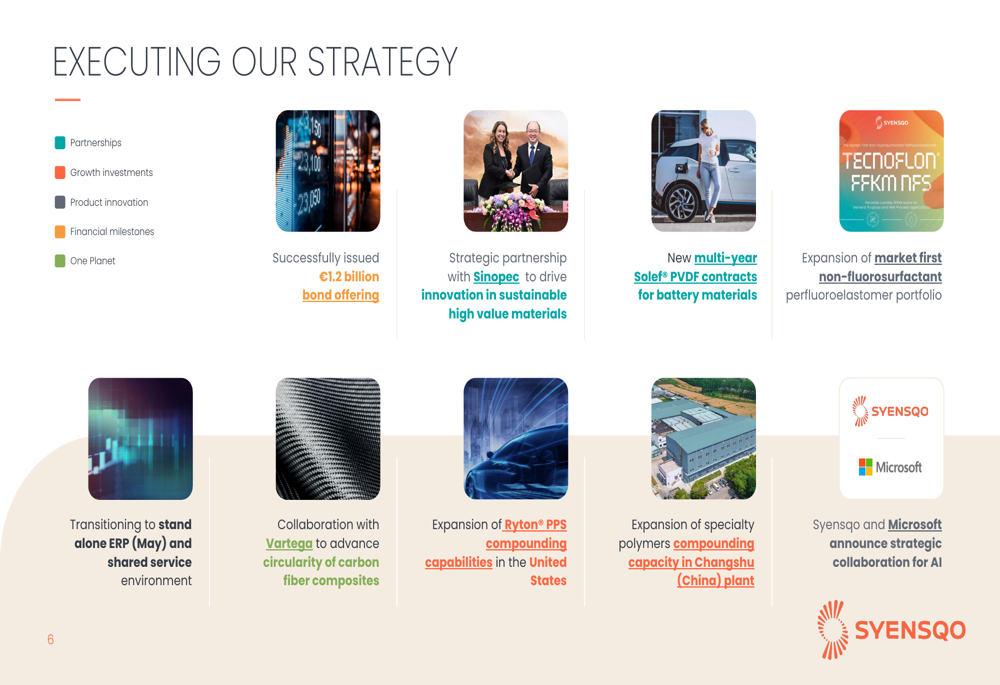 A Syensqo continuou a executar iniciativas estratégicas durante o trimestre, concentrando-se em inovação, sustentabilidade e transformação digital. A empresa formou uma parceria estratégica com a Sinopec para impulsionar a inovação em materiais sustentáveis de alto valor e garantiu novos contratos plurianuais para seus produtos Solef® PVDF para materiais de baterias.