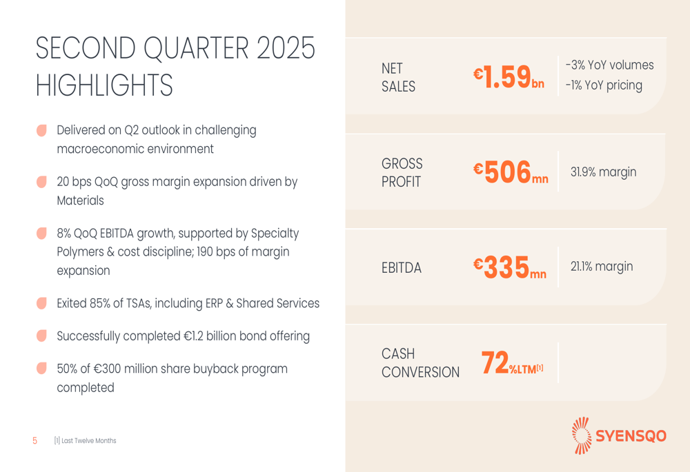 A Syensqo SA (EURONEXT:SYENS) apresentou seus resultados do segundo trimestre de 2025 em 31.07.2025, destacando a melhoria sequencial de margem apesar dos contínuos desafios macroeconômicos. A empresa de materiais especiais enfrentou obstáculos devido ao fortalecimento do euro e às tensões comerciais globais, mas conseguiu cumprir suas perspectivas trimestrais por meio de disciplina de custos e foco estratégico em segmentos de alto valor.