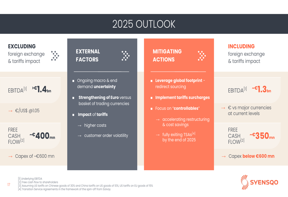 A empresa identificou vários desafios externos, incluindo incertezas macroeconômicas e de demanda final contínuas, o fortalecimento do euro em relação à sua cesta de moedas comerciais e o impacto das tarifas. Para mitigar esses desafios, a Syensqo planeja aproveitar sua presença global, implementar sobretaxas tarifárias, acelerar iniciativas de reestruturação e redução de custos, e sair completamente de todos os TSAs até o final de 2025.