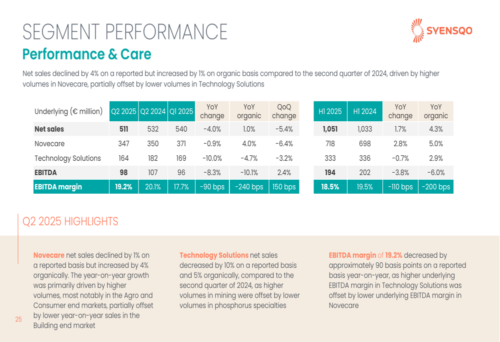 Performance & Care mostrou resiliência com crescimento orgânico de 4% na Novecare e crescimento de 3% em aplicações de mineração, compensando parcialmente os desafios em outras áreas. O negócio de Soluções Tecnológicas manteve margens brutas estáveis ano a ano, apesar de um declínio de 5% nas vendas orgânicas.