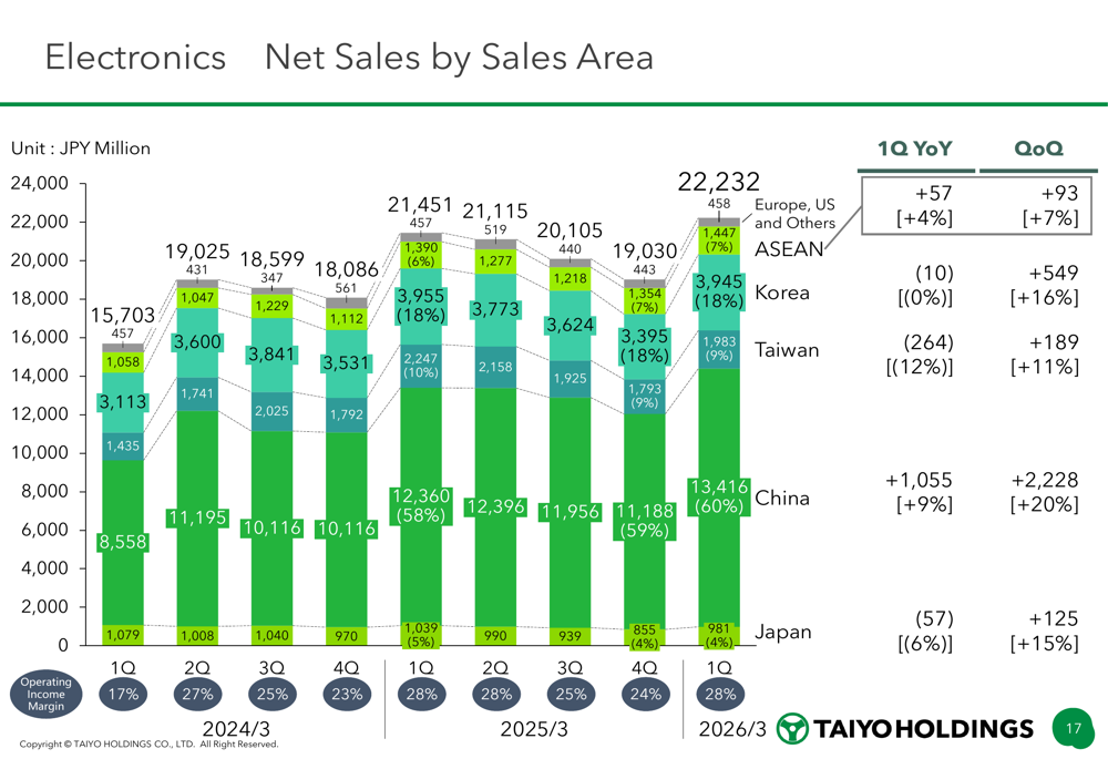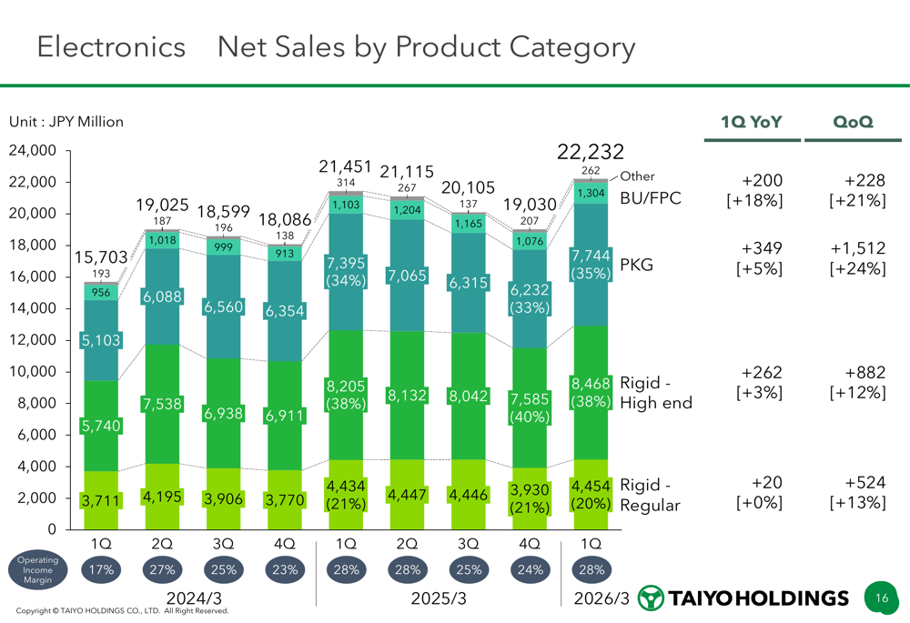 O segmento de Eletrônicos, o maior negócio da Taiyo Holdings, apresentou um aumento de 4% nas vendas líquidas em relação ao ano anterior, chegando a ¥ 22.232 milhões, com o lucro operacional crescendo 2% para ¥ 6.201 milhões. Este crescimento foi impulsionado principalmente pelo aumento do volume de vendas para produtos automotivos e smartphones, com demanda crescente por produtos de memória. O segmento manteve uma impressionante lucratividade com margem de lucro operacional de 28%.
