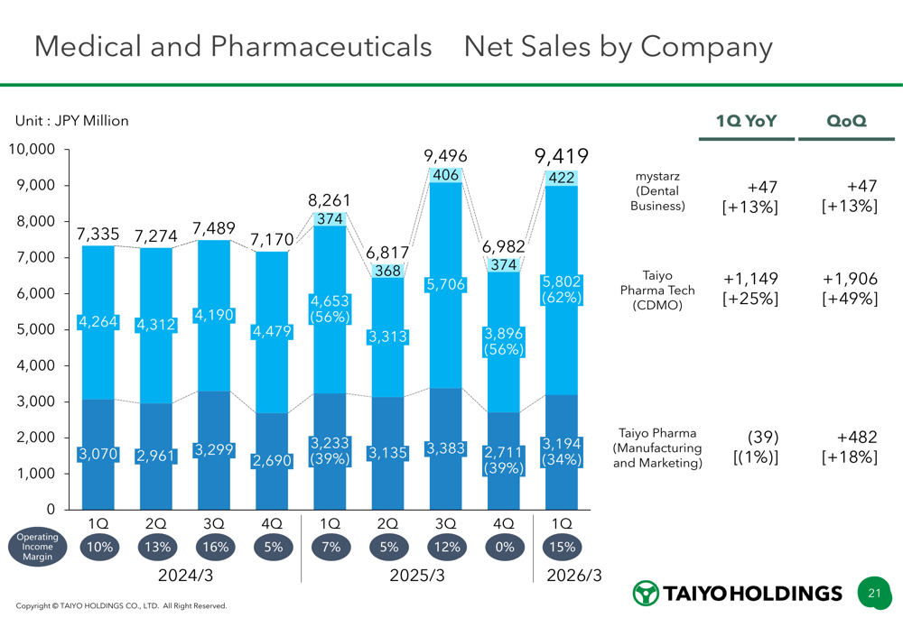 A divisão detalhada por empresa dentro deste segmento mostra um desempenho particularmente forte da Taiyo Pharma Tech, a organização de desenvolvimento e fabricação por contrato (CDMO):