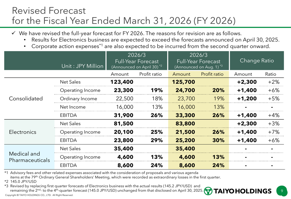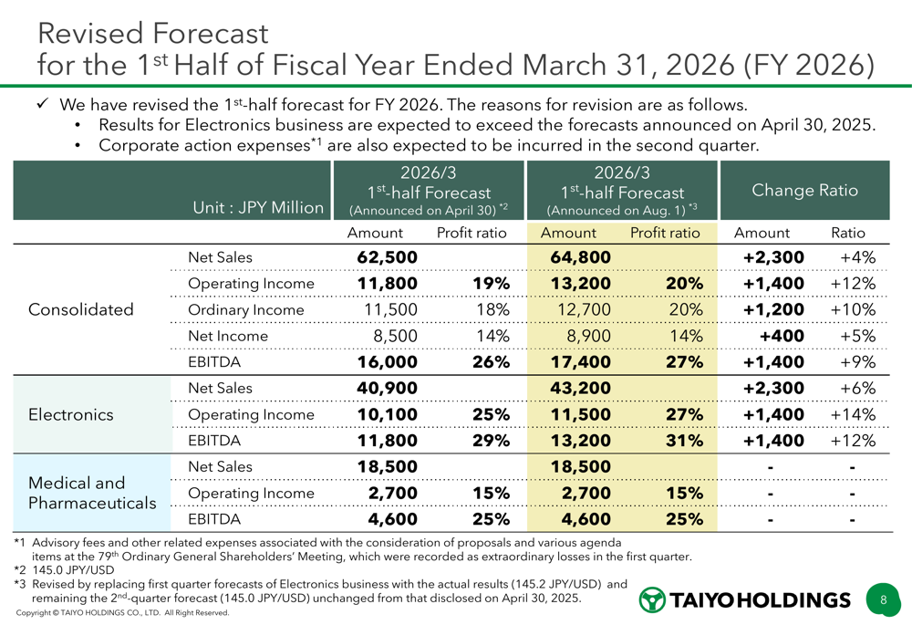 Com base no forte desempenho do primeiro trimestre, particularmente no segmento de Eletrônicos, a Taiyo Holdings revisou suas previsões para cima tanto para o primeiro semestre quanto para o ano inteiro do ano fiscal de 2026.