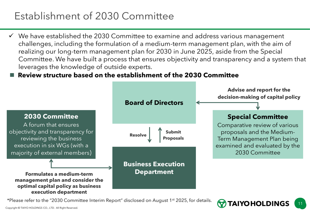 A Taiyo Holdings anunciou várias iniciativas estratégicas voltadas para o crescimento de longo prazo e melhoria da governança. Em 21.06.2025, a empresa anunciou uma mudança no Presidente e CEO, com Hitoshi Saito assumindo o comando. A empresa também destacou que conselheiros externos independentes agora constituem a maioria do seu Conselho de Administração, com quatro dos seis membros sendo independentes.