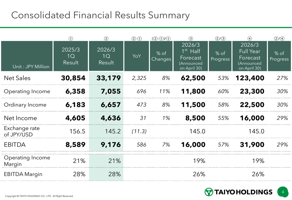A Taiyo Holdings reportou vendas líquidas consolidadas de ¥ 33.179 milhões para o 1º tri de 2026, representando um aumento de 8% em relação ao ano anterior, quando registrou ¥ 30.854 milhões no 1º tri de 2025. O lucro operacional cresceu em ritmo ainda mais acelerado, subindo 11% para ¥ 7.055 milhões, mantendo uma forte margem de lucro operacional de 21%.