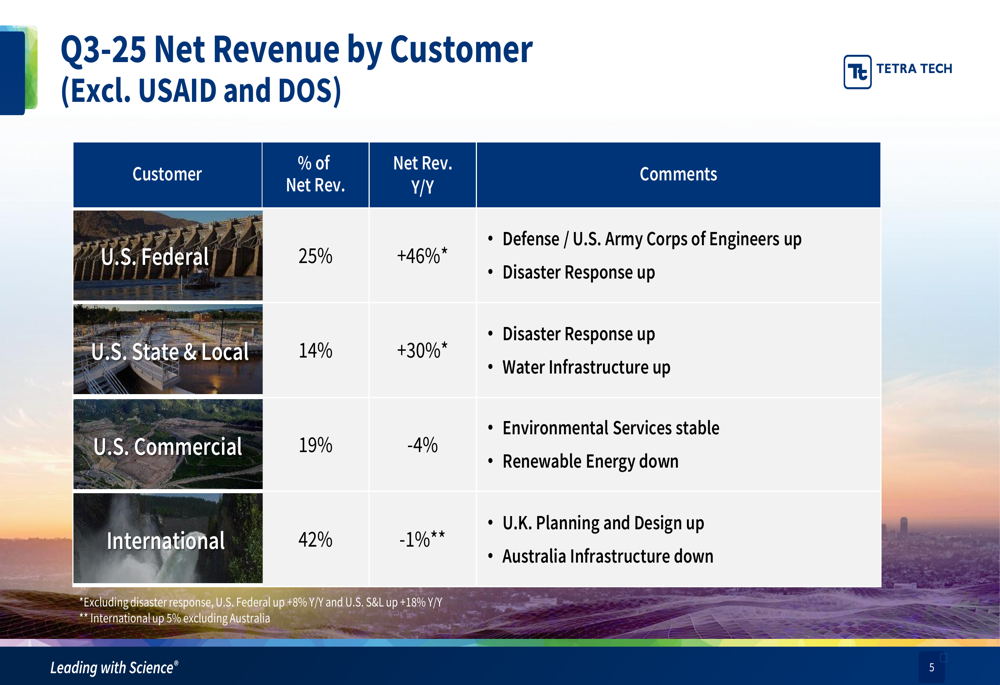 A análise de clientes revelou que os trabalhos para o governo federal dos EUA e governos estaduais e locais foram os principais impulsionadores do crescimento, aumentando 46% e 30% respectivamente, em grande parte devido a projetos de resposta a desastres e infraestrutura hídrica. No entanto, os negócios comerciais nos EUA diminuíram 4%, com projetos de energia renovável mostrando particular fraqueza. Os negócios internacionais também diminuíram ligeiramente em 1%, com crescimento no Reino Unido compensado por declínios na Austrália.