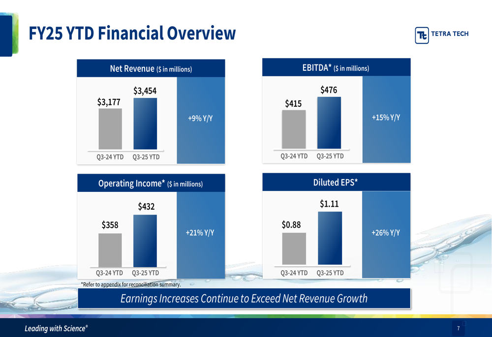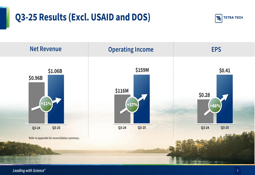 A Tetra Tech entregou resultados financeiros impressionantes no 3º tri de 2025, com receita líquida alcançando US$ 1,06 bilhão, um aumento de 11% em comparação ao mesmo período do ano anterior. Mais notavelmente, o lucro operacional disparou 37% em relação ao ano anterior, chegando a US$ 159 milhões, enquanto o lucro por ação cresceu 46% para US$ 0,41, demonstrando a capacidade da empresa de expandir margens e impulsionar a lucratividade.