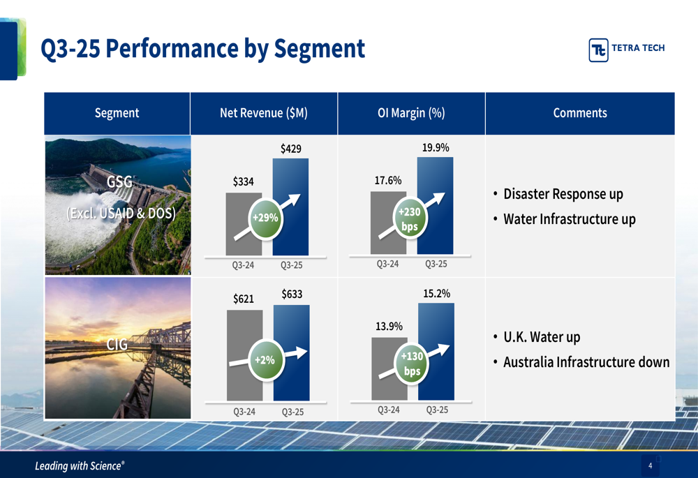 O desempenho da Tetra Tech variou significativamente entre seus segmentos de negócios e tipos de clientes. O Grupo de Serviços Governamentais (GSG), excluindo USAID e DOS, mostrou crescimento excepcional com um aumento de 29% na receita líquida e uma melhoria de 230 pontos base na margem de lucro operacional para 19,9%. Enquanto isso, o Grupo Comercial/Internacional (CIG) entregou um crescimento mais modesto de 2% na receita líquida, embora sua margem de lucro operacional tenha melhorado em 130 pontos base para 15,2%.