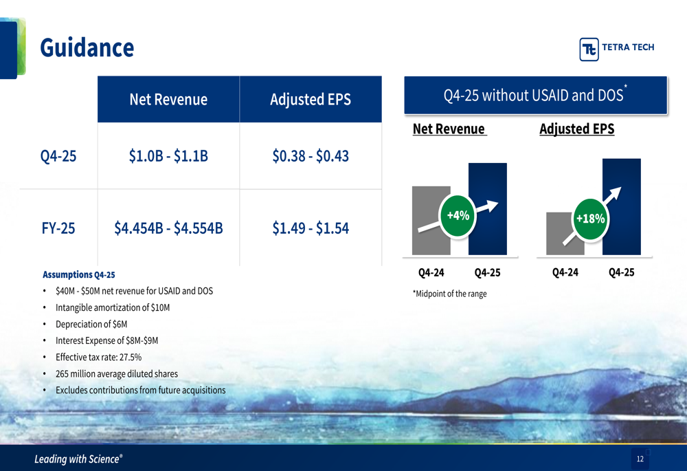 A orientação sugere um aumento de 4% na receita líquida e um aumento de 18% no LPA ajustado para o 4º tri de 2025, excluindo USAID e DOS: