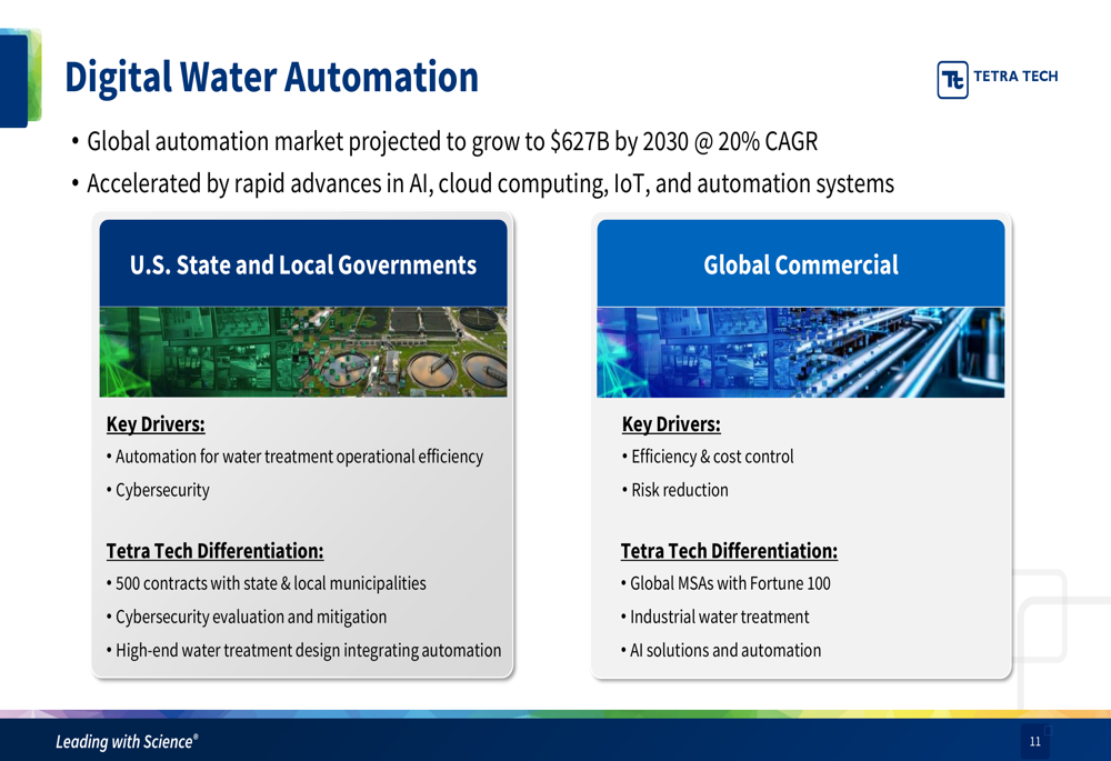 A Tetra Tech está se posicionando estrategicamente em mercados de alto crescimento, particularmente em automação digital de água. A empresa destacou que o mercado global de automação deve crescer para US$ 627 bilhões até 2030, a uma taxa composta anual de 20%, impulsionado por avanços em IA, computação em nuvem, IoT e sistemas de automação.