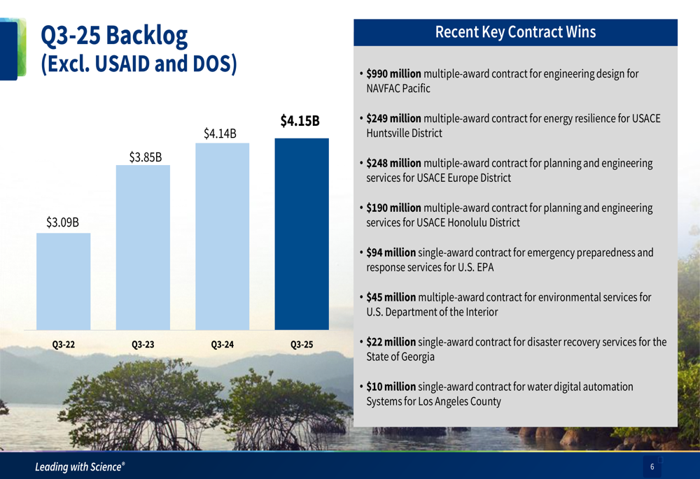 A carteira de pedidos da empresa permaneceu estável em US$ 4,15 bilhões, essencialmente inalterada em relação aos US$ 4,14 bilhões do ano anterior. No entanto, a Tetra Tech garantiu vários contratos significativos novos, incluindo um contrato de múltiplas adjudicações de US$ 990 milhões para design de engenharia para o NAVFAC Pacific e um contrato de múltiplas adjudicações de US$ 249 milhões para resiliência energética para o Distrito de Huntsville do USACE.