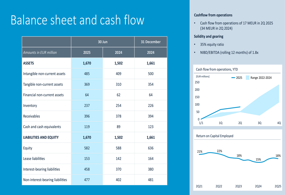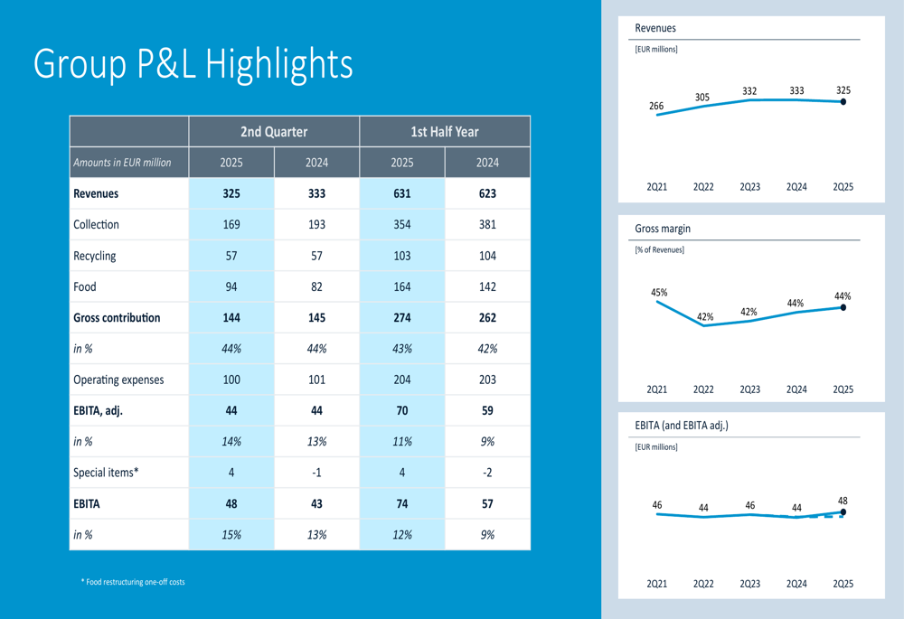 O desempenho da empresa variou significativamente entre os segmentos, com Coleta experimentando uma queda de 12% na receita, enquanto Alimentos entregou resultados recordes. Itens especiais incluíram um efeito positivo de €3,7 milhões do programa de redução de custos do segmento de Alimentos, contribuindo para um EBITA total de €48 milhões quando incluídos esses itens.