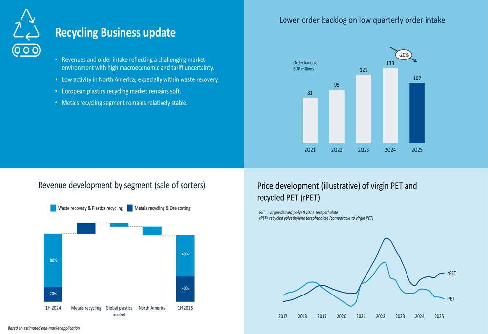 O segmento de Reciclagem reportou receitas estáveis de €57 milhões em comparação ao 2º tri de 2024, refletindo um ambiente de mercado desafiador com alta incerteza macroeconômica e tarifária. Os indicadores de entrada de pedidos e backlog indicam pressão contínua, com o backlog diminuindo 20% em relação ao ano anterior, para €107 milhões.