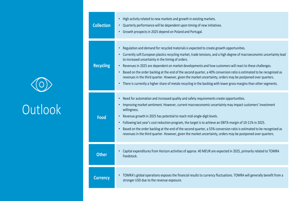 Olhando para o futuro, a TOMRA forneceu perspectivas específicas por segmento, observando alta atividade relacionada a novos mercados em Coleta, enquanto reconhece incertezas de mercado em Reciclagem. Espera-se que o segmento de Alimentos alcance um crescimento de receita de médio dígito em 2025: