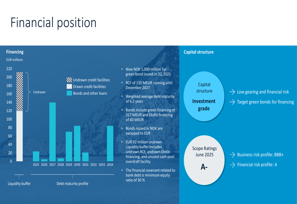 A TOMRA mantém uma posição financeira sólida com um índice de patrimônio líquido de 35% e uma relação NIBD/EBITDA de 1,8x. A empresa emitiu um novo título verde de NOK 1.000 milhões com prazo de 5 anos no 2º tri de 2025 e possui um prazo médio ponderado de dívida de 4,2 anos.