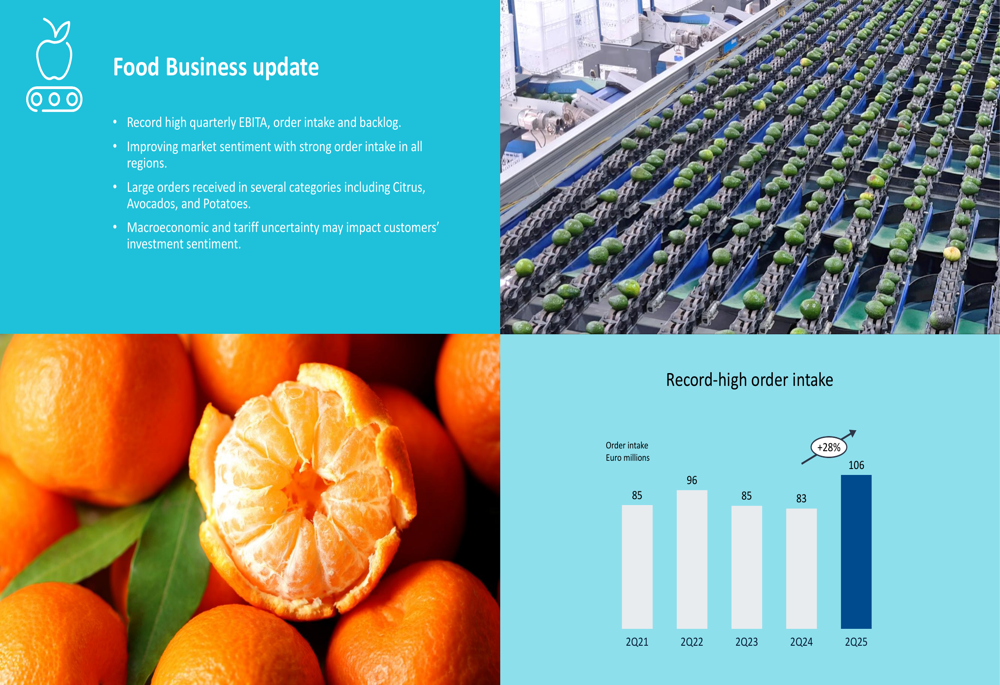 O segmento de Alimentos emergiu como o destaque da TOMRA no 2º tri de 2025, entregando recordes trimestrais de EBITA, entrada de pedidos e backlog. As receitas aumentaram 15% para €94 milhões, enquanto o EBITA mais que dobrou, de €8 milhões no 2º tri de 2024 para €20 milhões.