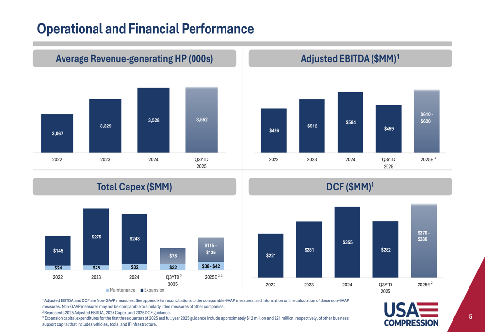 A apresentação da USA Compression revelou melhoria consistente em métricas financeiras-chave nos últimos anos. O EBITDA ajustado da empresa cresceu constantemente de US$ 426 milhões em 2022 para uma projeção de US$ 610-620 milhões para o ano completo de 2025.