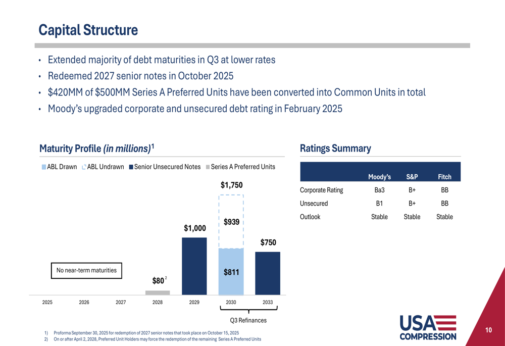 A USA Compression destacou vários desenvolvimentos importantes na estrutura financeira em sua apresentação. A empresa estendeu a maioria de seus vencimentos de dívida no 3º tri a taxas mais baixas e resgatou suas notas sênior de 2027 em outubro de 2025. Adicionalmente, a empresa recebeu upgrades de classificação de crédito da Moody’s em fevereiro de 2025.