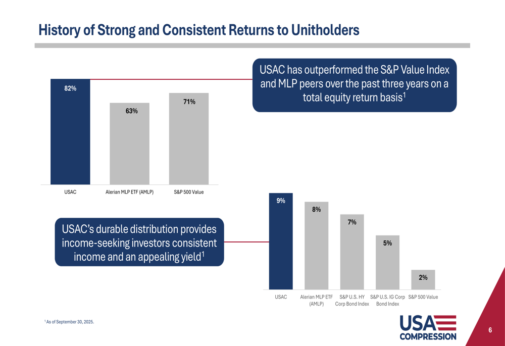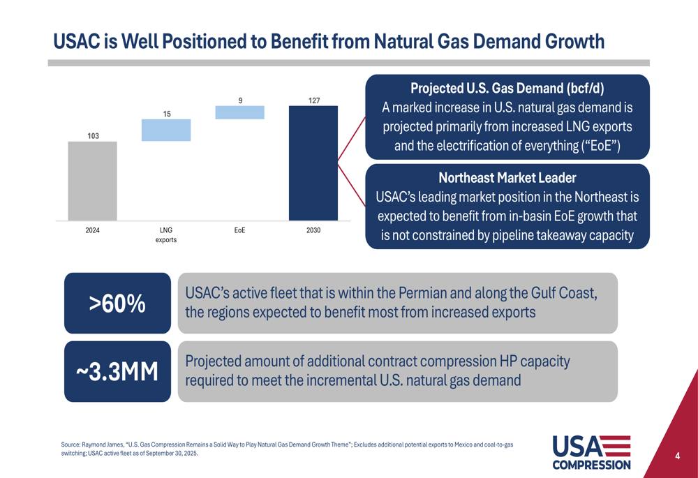 Mais de 60% da frota ativa da USA Compression está estrategicamente localizada na Bacia do Permiano e ao longo da Costa do Golfo, posicionando a empresa para beneficiar-se diretamente do aumento da atividade de exportação de GNL. Além disso, como líder de mercado no Nordeste dos EUA, a USAC está bem posicionada para capitalizar o crescimento da eletrificação nas bacias.