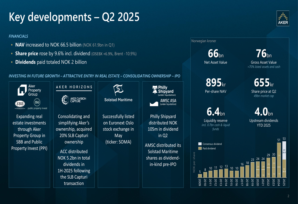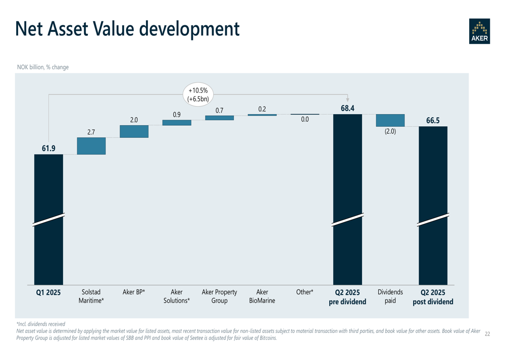 O desenvolvimento do Valor do Patrimônio Líquido da Aker do 1º tri ao 2º tri de 2025 mostra as contribuições de várias empresas do portfólio. Os maiores contribuintes positivos foram a Solstad Maritime (NOK 2,7 bilhões) e a Aker BP (NOK 2,0 bilhões), enquanto os dividendos pagos reduziram o NAV em NOK 2,0 bilhões.