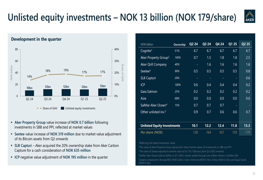 Os investimentos em ações não listadas totalizaram NOK 13 bilhões, representando 17% do total de ativos. A Cognite, empresa de software industrial da Aker, representa o maior ativo não listado com NOK 6,7 bilhões, seguida pela Aker Property Group com NOK 2,5 bilhões.