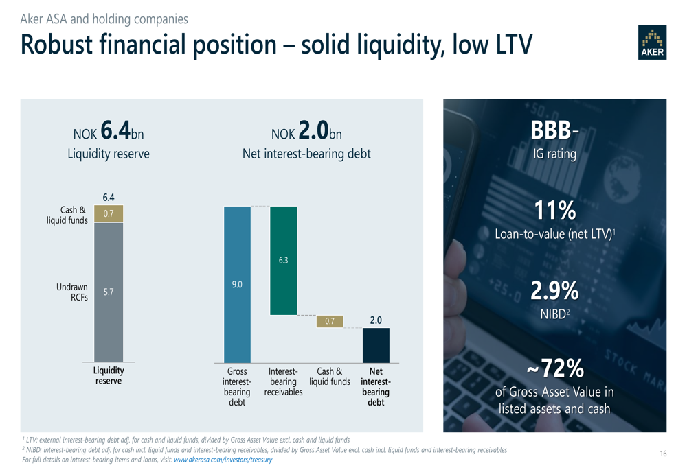 A Aker mantém uma posição financeira robusta com uma reserva de liquidez de NOK 6,4 bilhões e dívida líquida com juros de NOK 2,0 bilhões, resultando em uma baixa relação empréstimo-valor de 11%. O perfil de vencimento da dívida da empresa está bem estruturado, sem vencimentos em 2025-2026 e com um vencimento médio da dívida de 3,3 anos. A Aker mantém uma classificação de crédito BBB-/Estável.