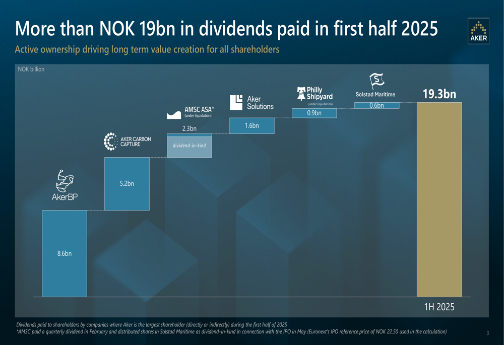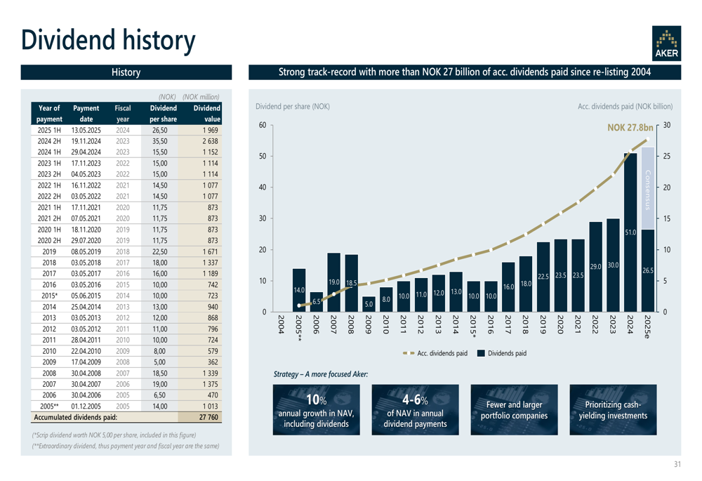 A empresa manteve uma política de dividendos consistente ao longo do tempo, com mais de NOK 27 bilhões em dividendos acumulados pagos desde a relisting em 2004. A Aker tem como alvo pagamentos anuais de dividendos de 4-6% do NAV e alcançou um crescimento anual de 10% no NAV, incluindo dividendos.