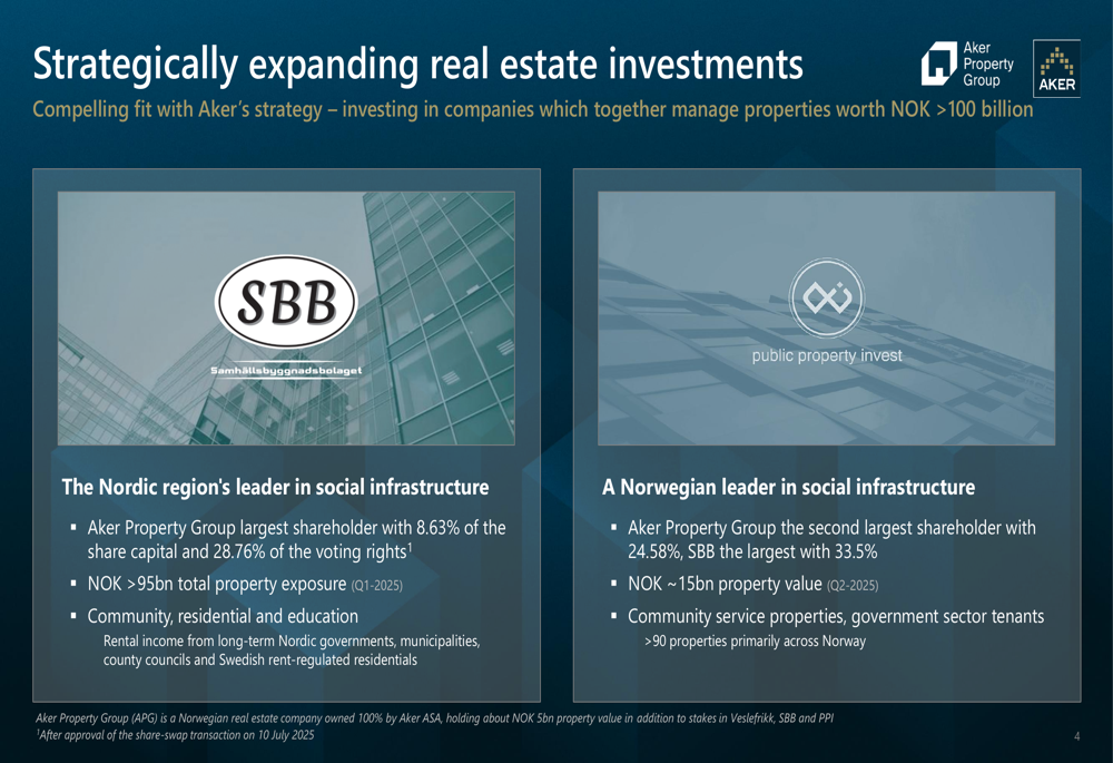 A empresa está expandindo significativamente seus investimentos imobiliários por meio da Aker Property Group, que se tornou a maior acionista da SBB (Samhällsbyggnadsbolaget) com 8,63% do capital social e 28,76% dos direitos de voto. Além disso, a Aker Property Group detém uma participação de 24,58% na Public Property Invest, tornando-se a segunda maior acionista. Esses investimentos dão à Aker exposição a propriedades avaliadas em mais de NOK 100 bilhões.